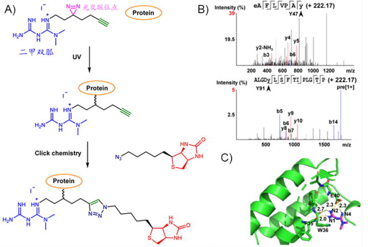 近日,廈門大學林圣彩院士與鄧賢明教授利用化學蛋白質(zhì)組學技術(shù)揭示了二甲雙胍的分子靶點,研究團隊通過對二甲雙胍結(jié)構(gòu)改造,使其具有光交聯(lián)位點。應用原位快速光交聯(lián)策略和點擊化學反應,利用質(zhì)譜檢測,鑒定出PEN2蛋白上與二甲雙胍相關(guān)的關(guān)鍵活性位點F35和E40。(成果刊已發(fā)表:《Nature》(DOI: 10.1038/s41586-022-04431-8))